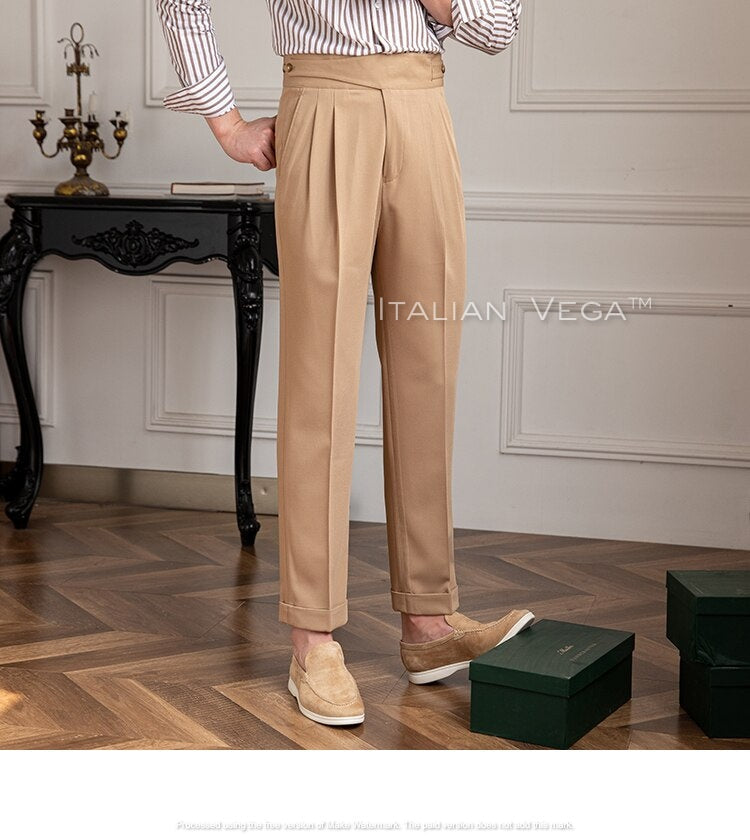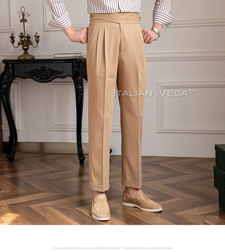 Introducing the epitome of elegance and comfort - the Italian Vega Classic Gurkha Pants. Crafted with meticulous attention to detail, these trousers redefine sophistication. Inspired by the iconic Gurkha style, they blend tradition with modernity seamlessly. Whether it's a formal affair or a casual rendezvous, these pants effortlessly elevate your look. Made by Old Money Clothing, renowned for timeless fashion, each pair exudes luxury. Elevate your wardrobe with Italian craftsmanship and timeless style. Step into refinement with the Italian Vega® Classic Gurkha Pants today.